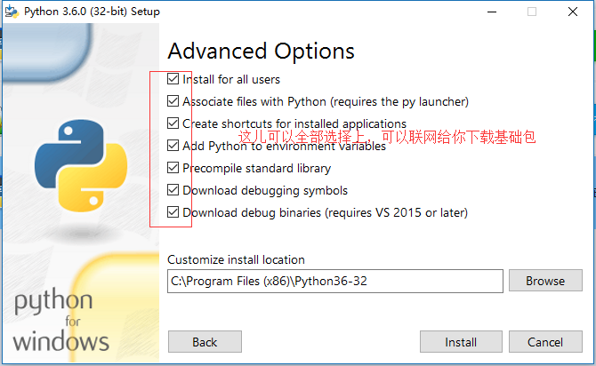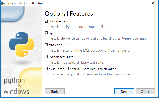 - 点击下一步:注意图中勾选红色的部分,安装pip,可以用来安装其他应用包,必备