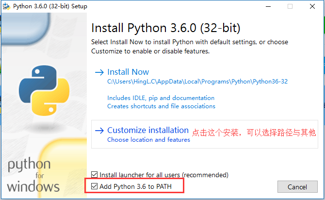 - 注意:图中勾选红色的地方一定要够选择上,避免手动配置环境变量,方便在cmd中输入Python,直接进入到Python交互式界面