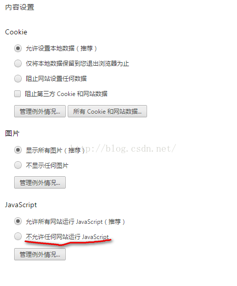 点击右上方-->设置-->最下面点击“显示高级设置”-->点击“内容设置”按钮-->弹窗选择“不允许任何网站运行 JavaScript”
