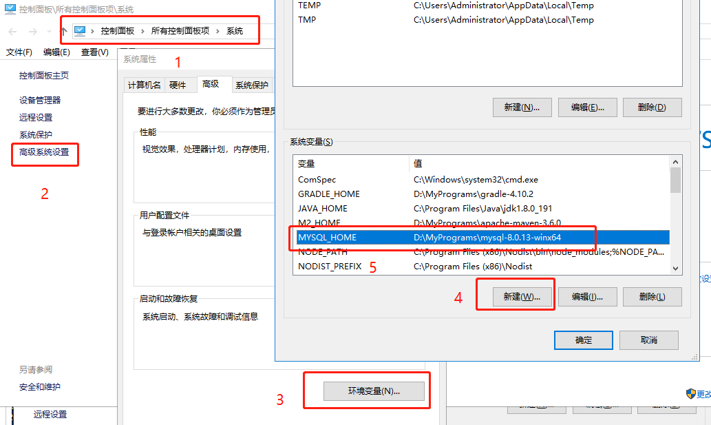 如下图1的路径,打开【系统】,点击2【高级系统设置】,打开系统属性,选择3【环境变量】弹出窗口,选择系统变量中的4【新建】,弹窗,变量名为:MYSQL_HOME,路径是刚刚解压的路径,确定以后如图中5。
