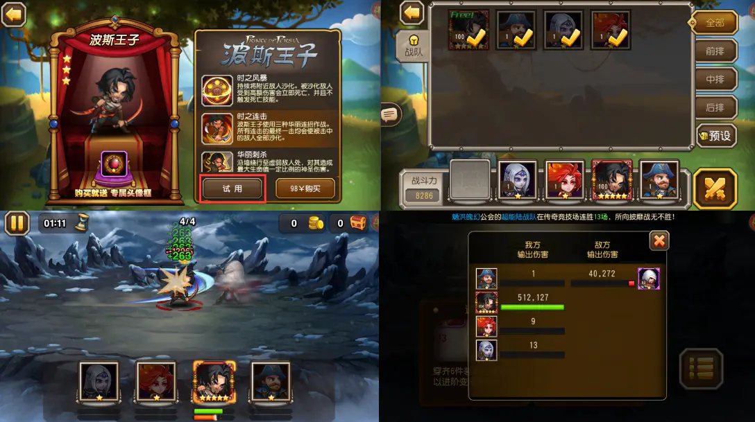 提前体验。游戏中有的时候增加了新的强力英雄会为玩家提供试玩,让玩家提前感受新角色的强大,比如小冰冰传奇(刀塔传奇)中提供了新英雄波斯王子,为了让玩家感受其强大,玩家可以点击试玩,试玩过程中玩家选择5个角色和波斯王子组队,波斯王子装备和技能都是顶级,挑战对方也多是顶级队,很可能自己的角色第一关都没过都别灭了,但是波斯王子一个人完成了单刷,尤其是挑战第三轮的boss时各种酷炫技能展示让玩家感觉这个英雄养成后的强大,玩家一时冲动就可能掏出99元为这个提前感受了强大的角色买单,而一旦买单拿到的是初级英雄,想要将这个英雄养大又需要持续投入大量的时间和金钱,99元就成了存量的一部分。