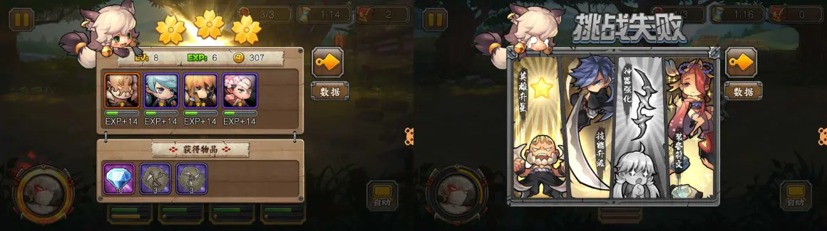 对战后:结果反馈。对战结果包含三种,成功,失败,平局。游戏设计了不同的反馈效果,成功的时候会金光闪闪,提示玩家获胜奖励;失败的时候UI整体暗淡,告知玩家挑战失败,同时提示玩家继续努力。为了区分成功,游戏还会把成功分为不同等级。保卫萝卜中,通过金萝卜,银萝卜,铜萝卜区分,愤怒的小鸟和割绳子中通过三星、两星和一星展示完成情况。卡牌类游戏中玩家完美通过获得三星,一张地图中获得三星数量不同还可以解锁不同的宝箱,刺激玩家追求完美挑战。