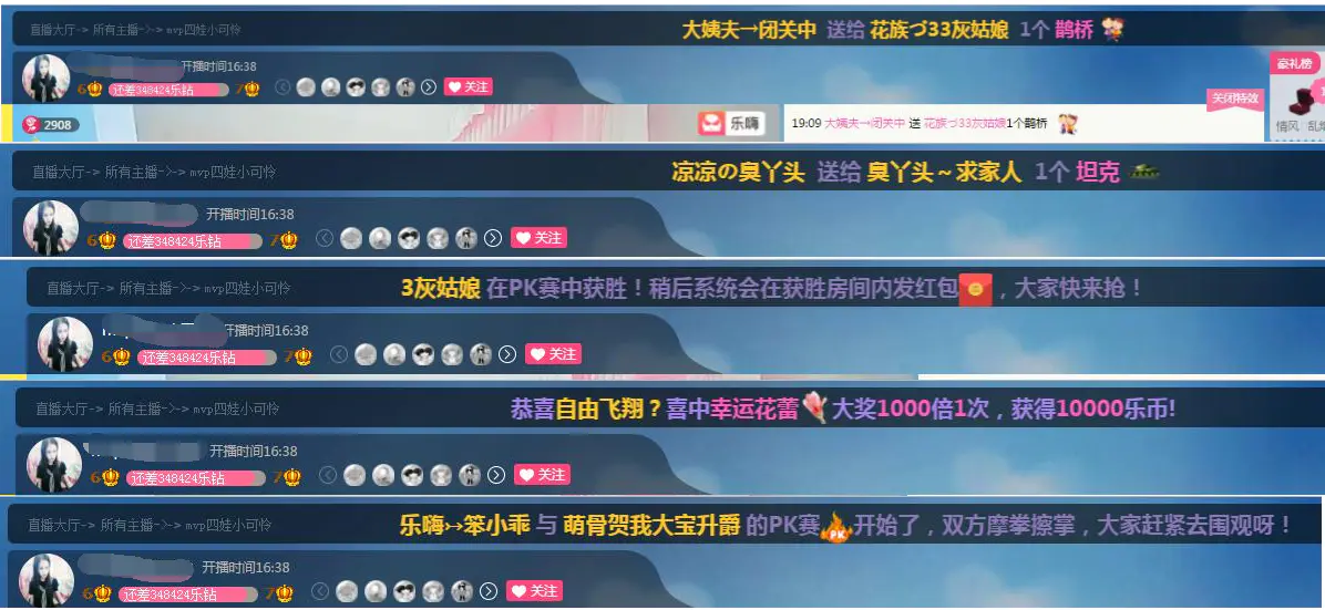 直播平台会使用世界通知这种类似游戏的设计,当某个财主送出高价值礼品时,自动发布世界通知,这种通知对其他用户影响不大,但是,世界通知后会让赠送者和接收者自身会感觉很有面子。当用户抽奖中大奖了,也会触发世界消息,让玩家感觉幸运还是其次,告诉其他抽奖没中的用户还有机会是这种世界消息的主要目的;主播PK触发世界消息,告诉其他用户马上就会有主播PK,刺激没有明确目标的用户前往观看,拉动平台活跃。如下图所示:
