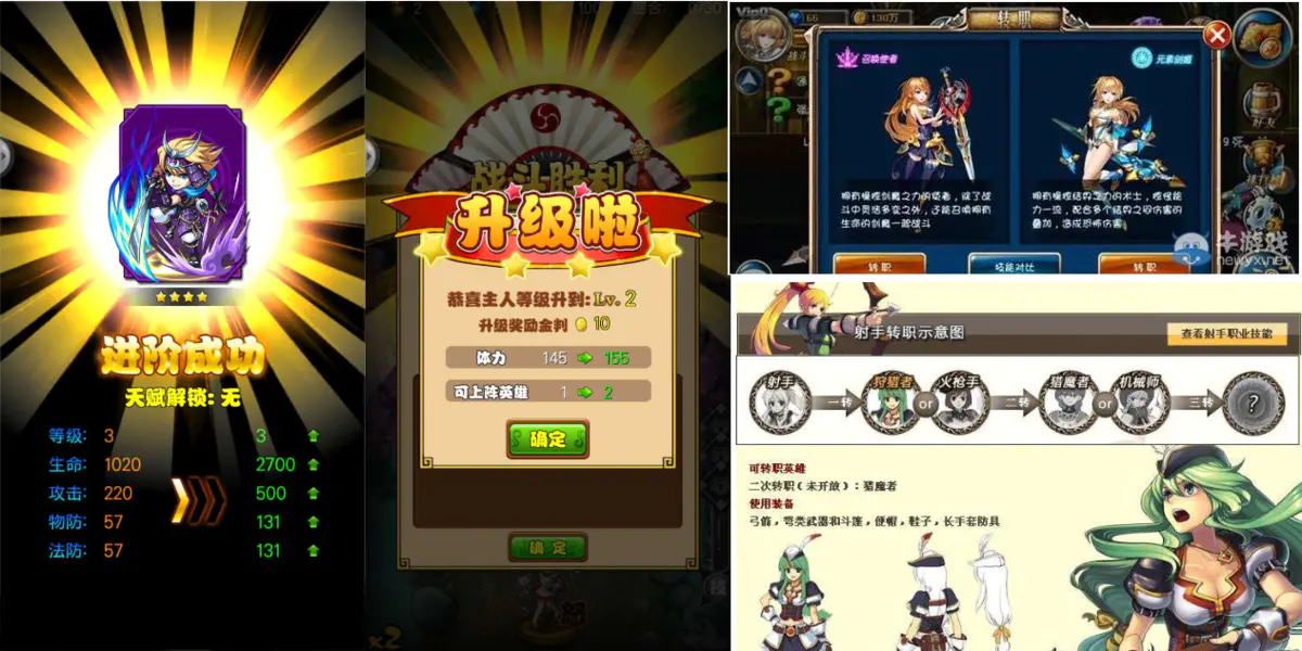 对战后:成长反馈。成就篇中我们介绍了玩家可以通过完成挑战而实现人物的升级或专职,让玩家感觉到自己持续成长,这种成长会通过数值的变化告诉玩家,如下图所示: