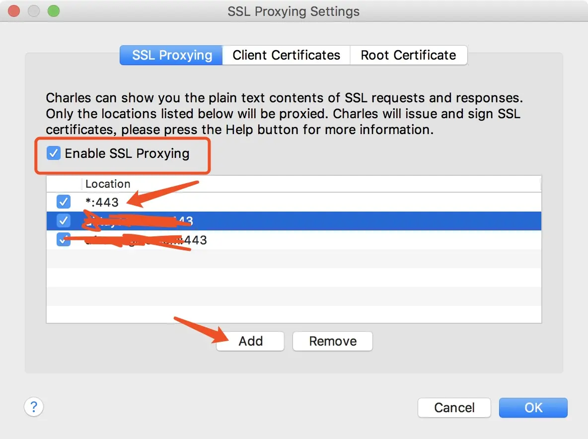 手机安装好证书以后,打开Charles的菜单:Proxy-->SSL Proxying Settings