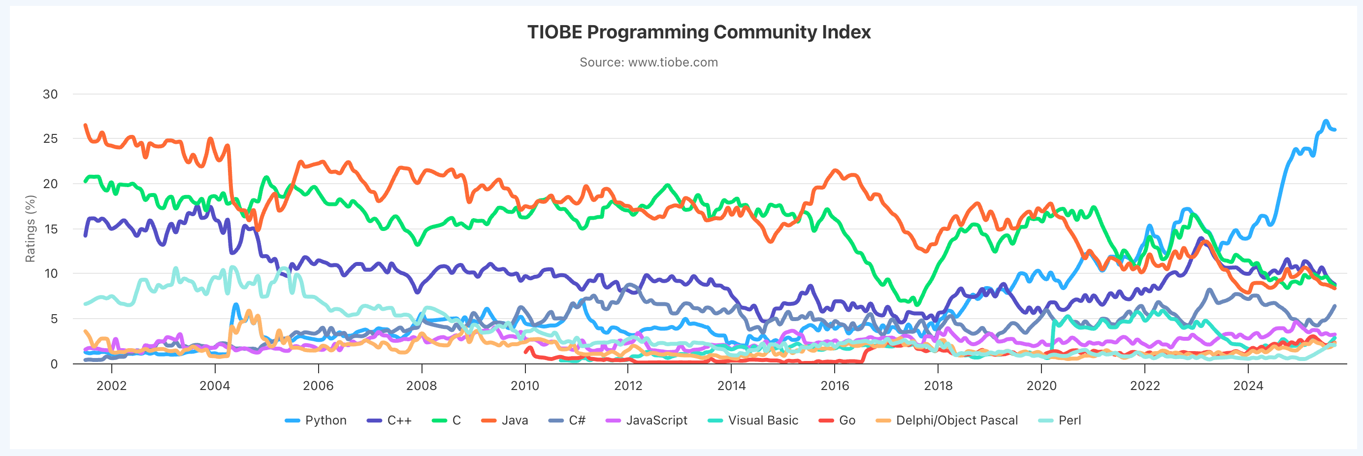 2022年12月,一个不为人注意的转折点悄然发生:C++ 在 TIOBE 编程语言排行榜上超越 Java,成为世界第三大流行的编程语言。到 2024 年底,它更是攀升至第二位,仅次于 Python。这一里程碑没有登上头条,没有引发网络热议,也没有什么"新 C++"的营销活动。然而,在服务器集群、游戏引擎、自动驾驶汽车和航天器中,世界早已运行在 C++ 之上。