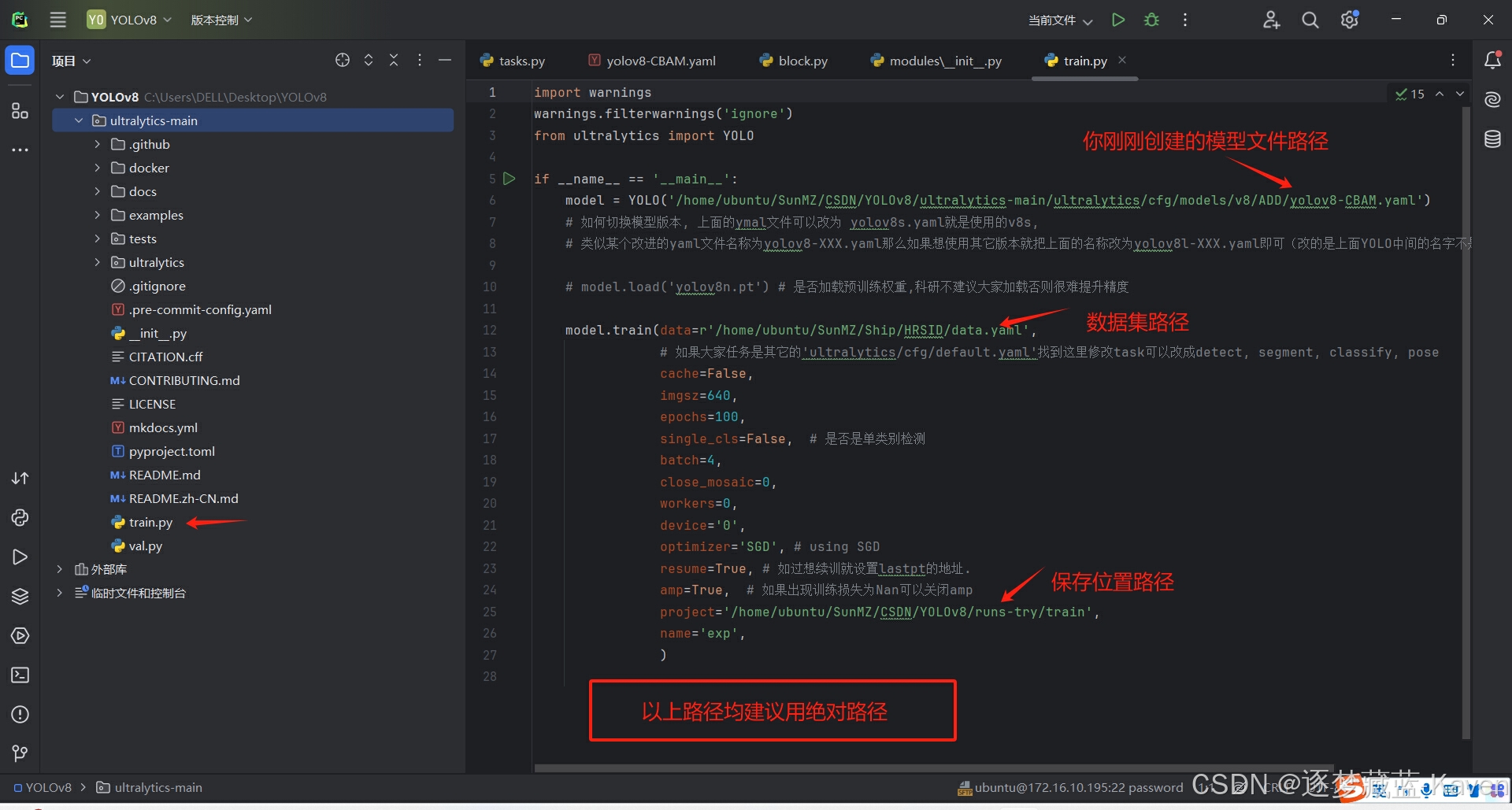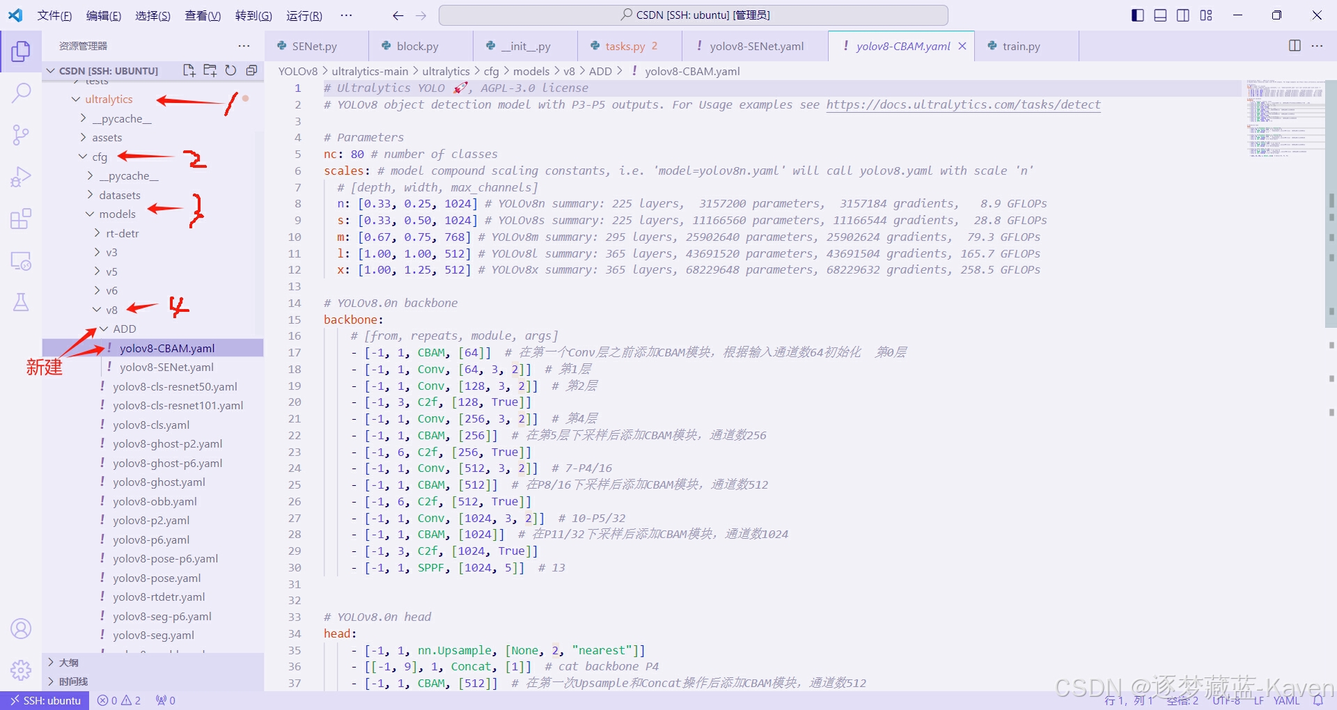 2.复制yolov8-CBAM.yaml文件内容到新建的yolov8-CBAM.yaml文件中并保存。