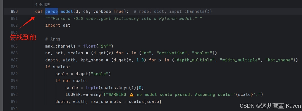 - 编写parse_model函数,首先你需要按住Ctrl和F,搜索def parse_model并跳转到这个函数的定义,然后开始往下滑找到如图7所示的位置(行数不一定相同,注意周围内容),并且输入解析函数,解析函数如下: