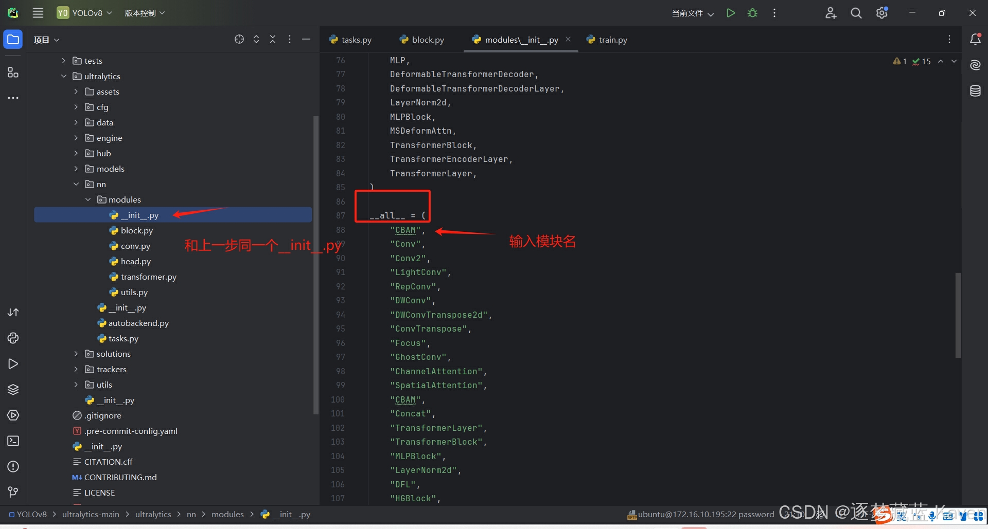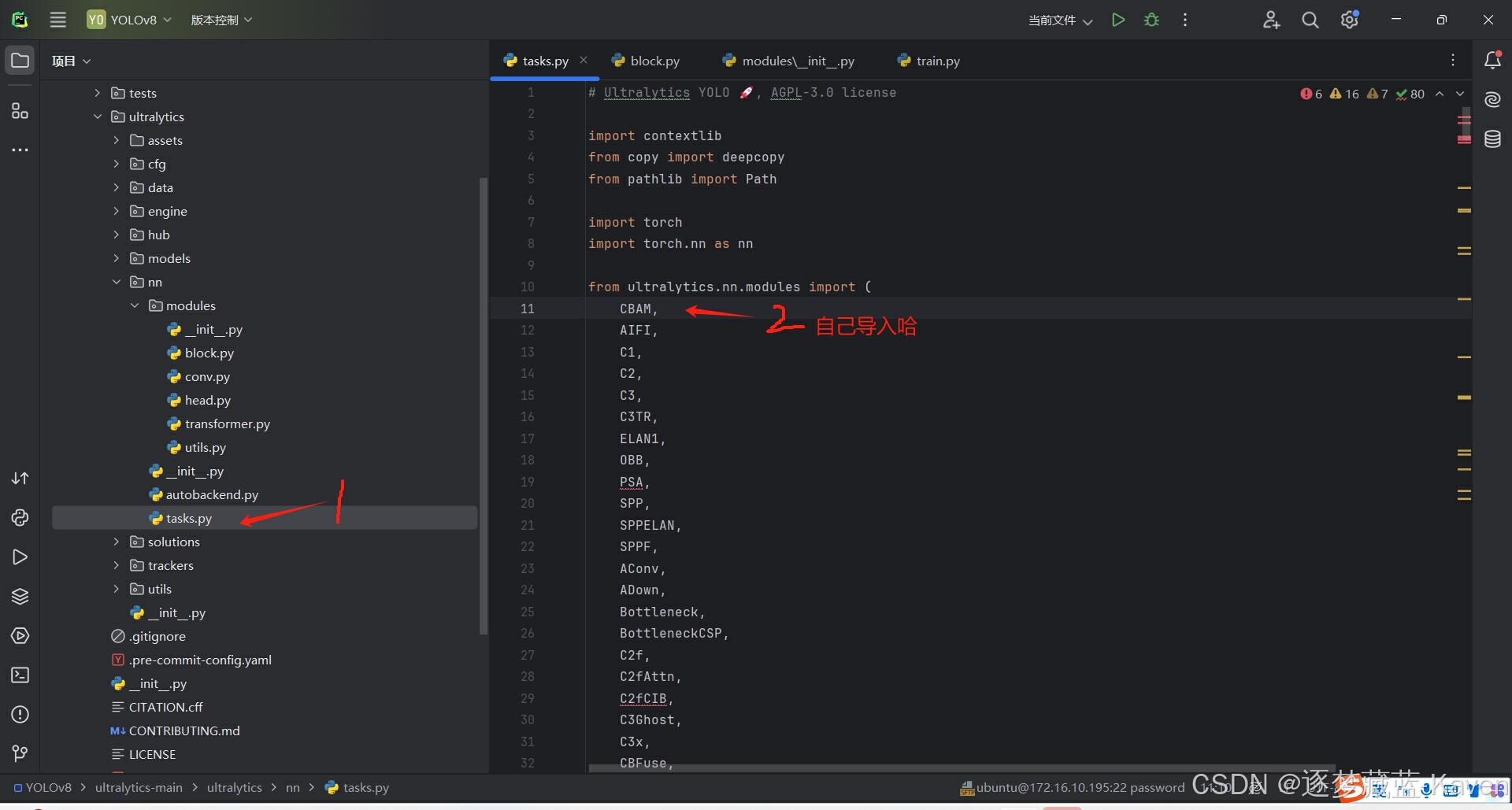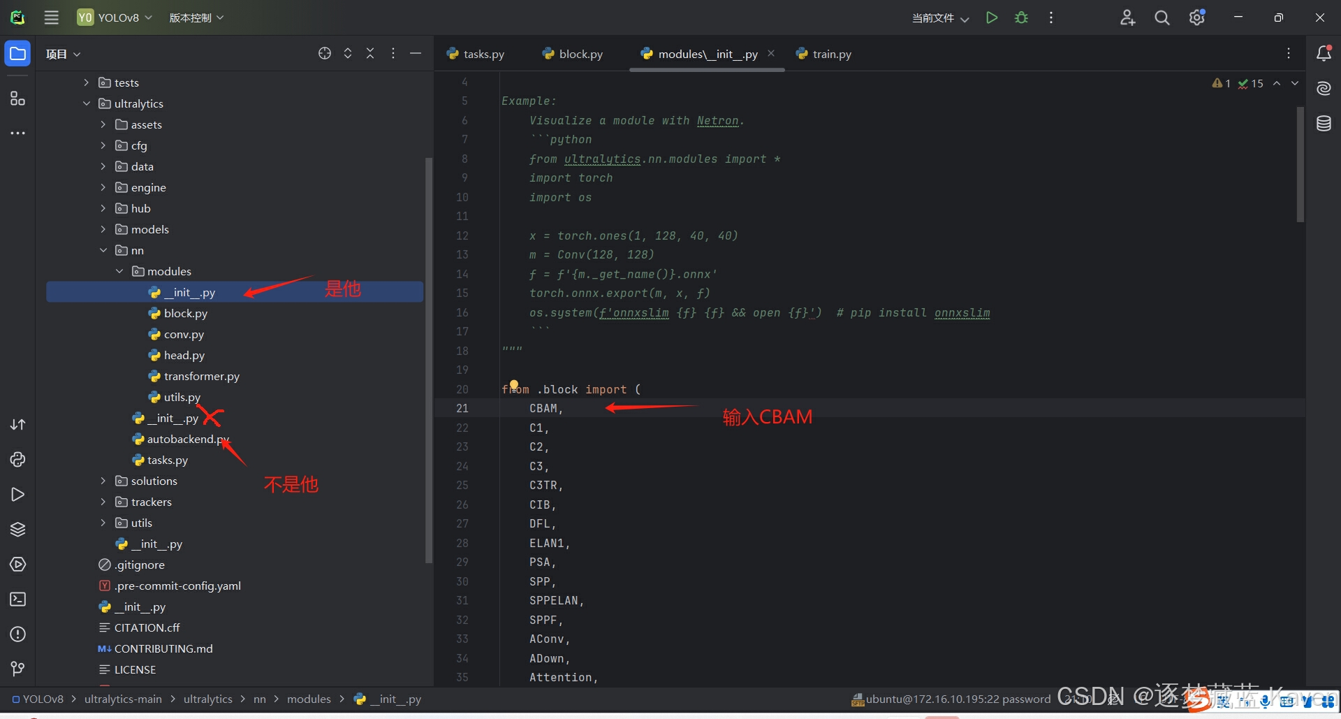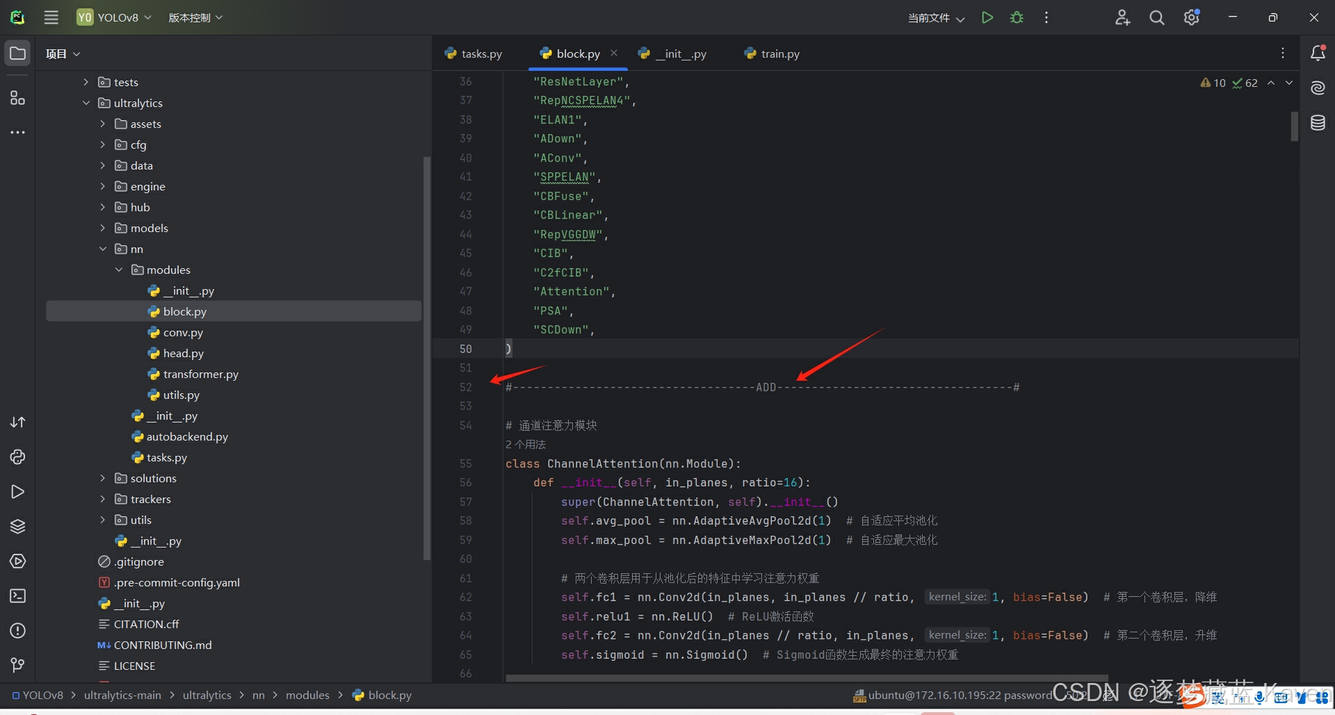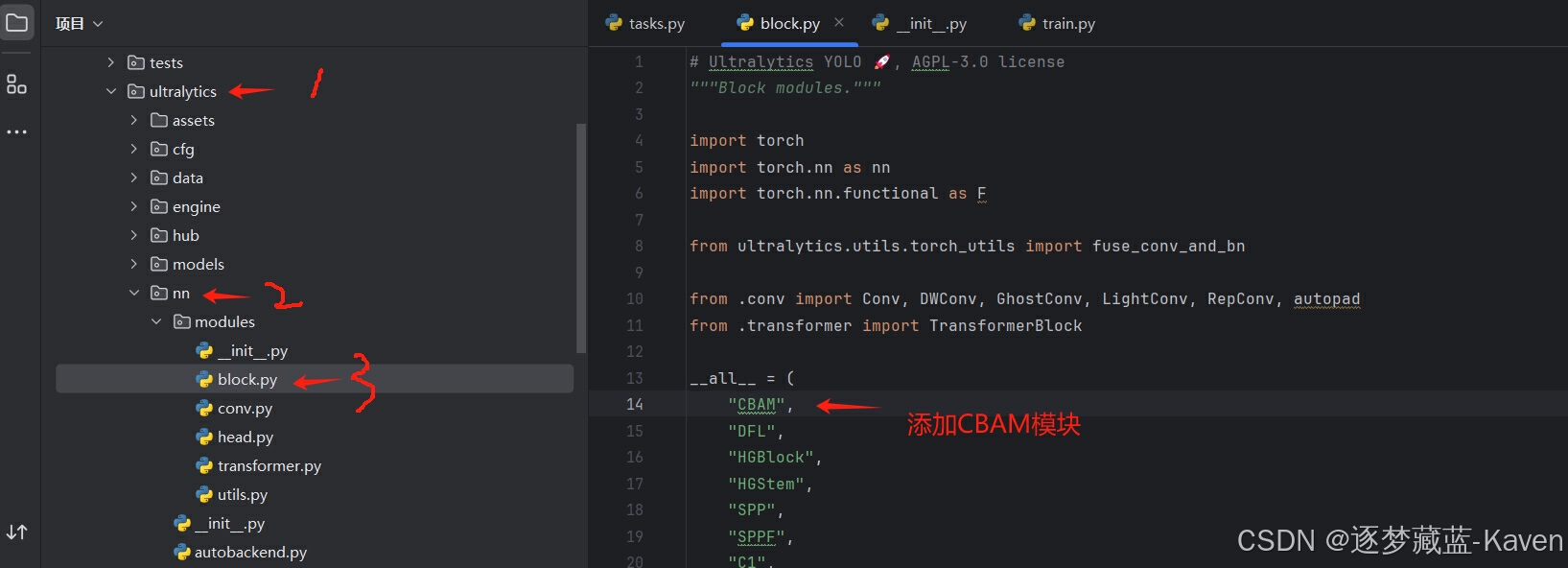 - 找到并打开“YOLOv8\ultralytics-main\ultralytics\nn\modules\block.py”文件,在箭头位置添加CBAM模块,如图2