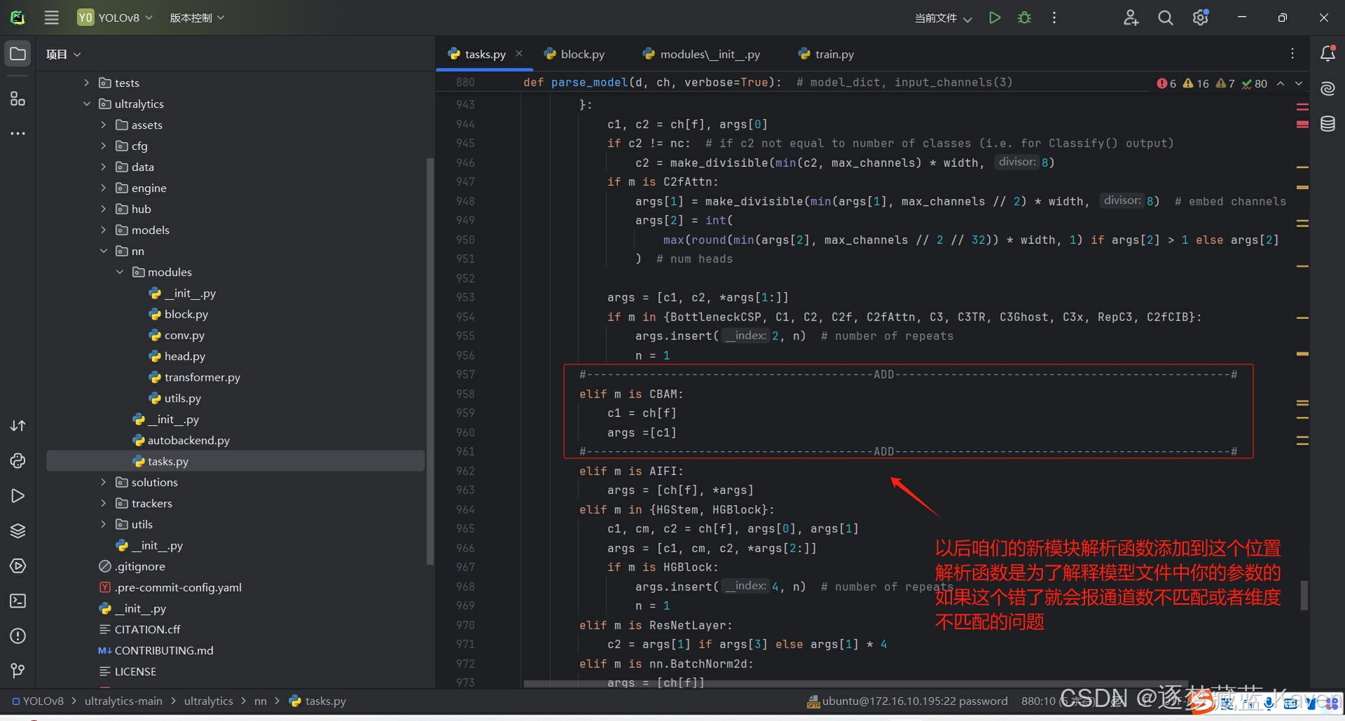 #注意事项:将这部分代码放入图中位置,我的是第957行,各位看看附近的内容一样再去添加 #-----------------------------------------ADD------------------------------------------------# elif m is CBAM: c1 = ch[f] args =[c1] #-----------------------------------------ADD------------------------------------------------#图示教学过程: