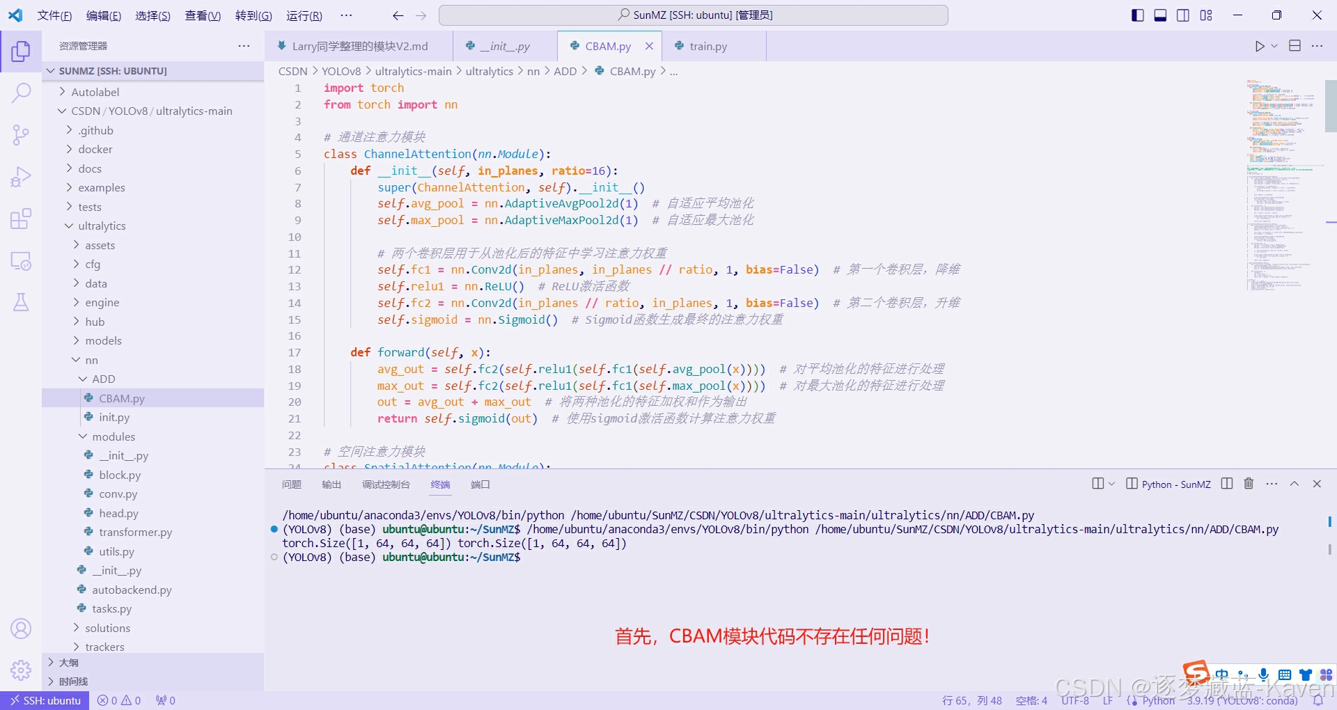 - 可自行找位置新建一个"CBAM.py"将上述代码粘贴进去出现下面,不报错说明没问题,否则不可直接用,如图1(提供的代码准确无误)