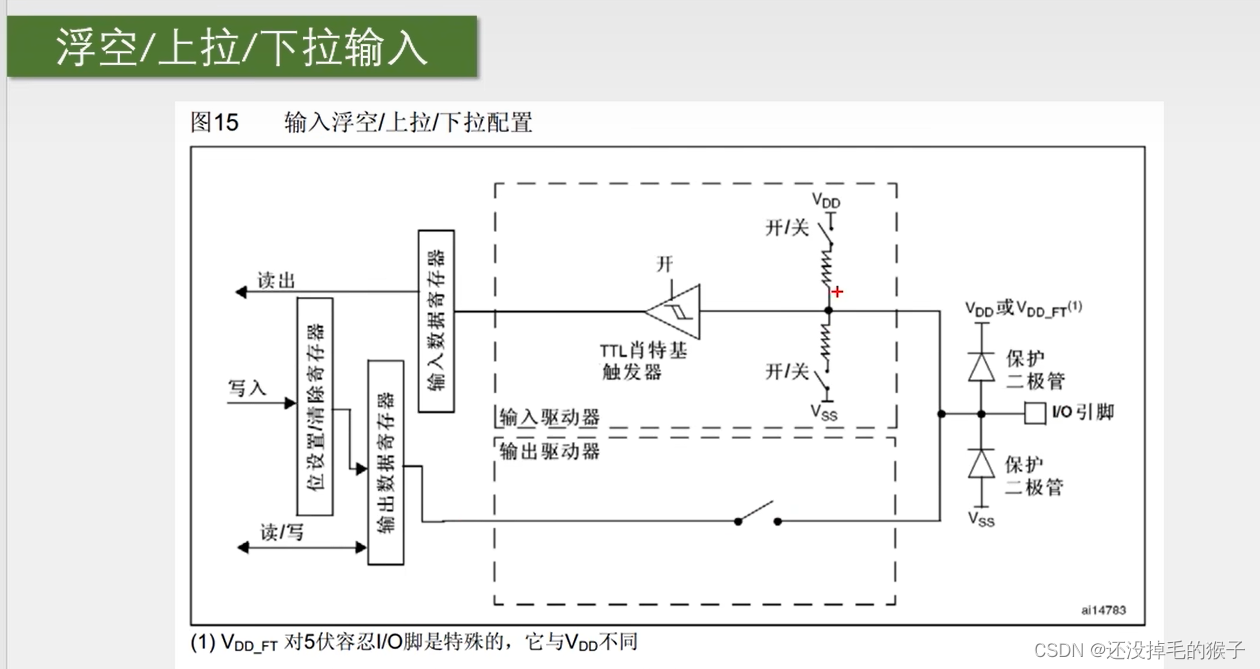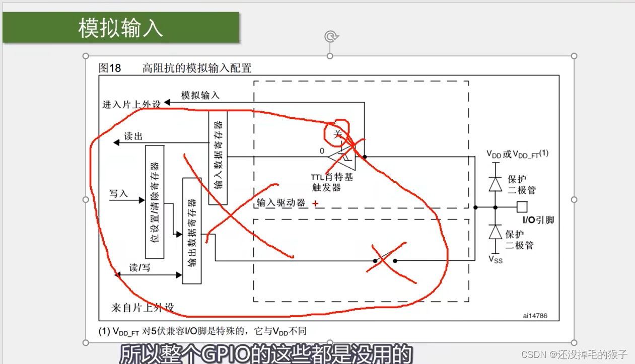 IO保护二极管作用 :VDD接3.3v,当输入电压高于3.3v,电位高于VDD,电流从VDD流出,不流入电路,避免过高电压伤害电路从而保护电路。VSS接0v,当输入电压低于VSS电压,电压为相对于VSS的电压,所以存在负电压,电流从VSS流出IO口,所以保护内部电路无电流。
