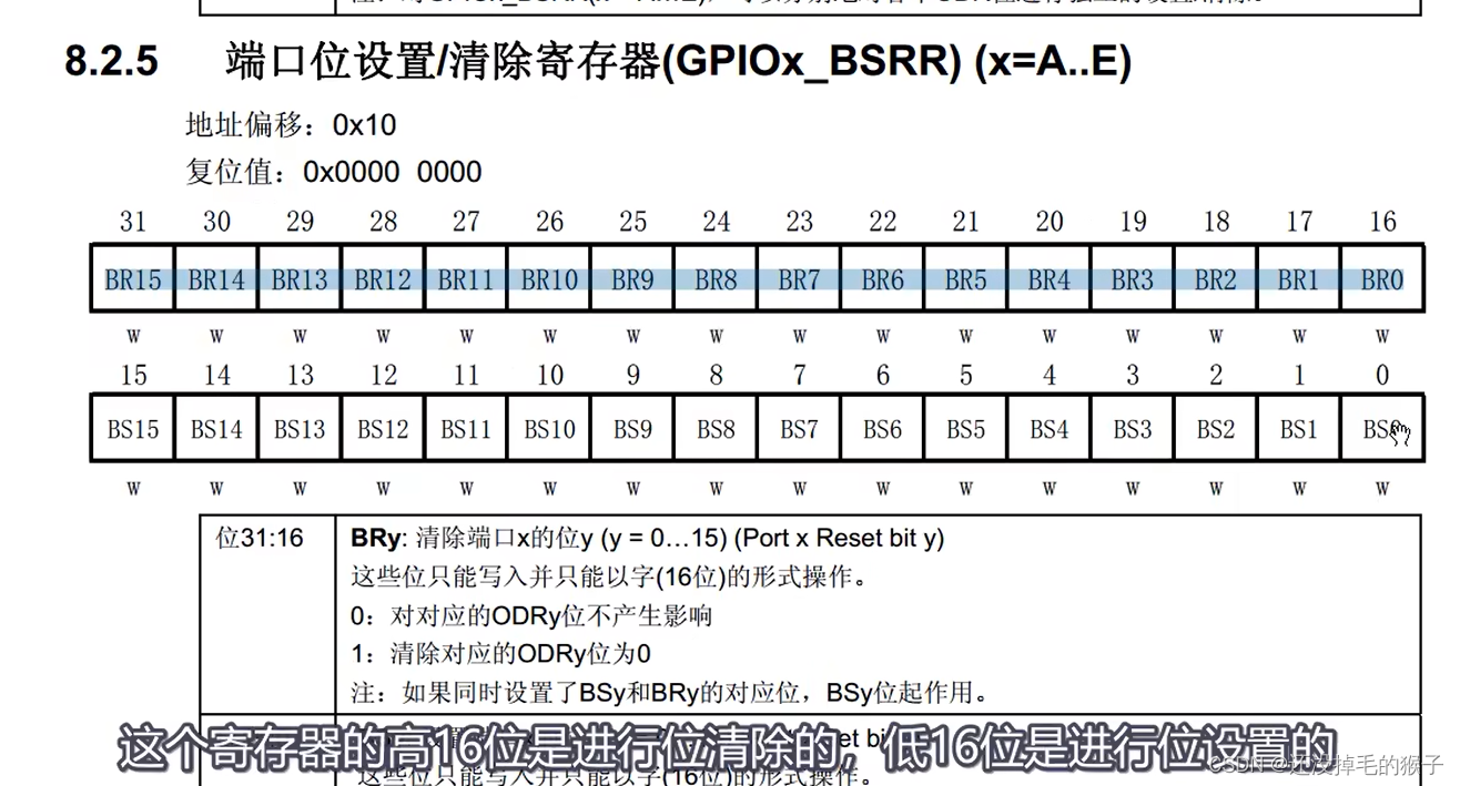 如果要将某一位置0,则在位清除寄存器对应位写1,其他位写0,这样就会把写1的对应位置0,其他味不变。