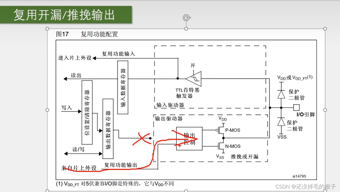 数字部分由输出数据寄存器和片上外设部分控制,两种控制方式,通过数据选择器接到输出控制部分,输出数据寄存器是普通IO口输出,写某一位就可以操作某一位端口,位设置/清除寄存器是用来单独操作输出数据寄存器的某一位而不影响其他位的。因为输出寄存器只能控制16个端口,并且只能整体读写。如果想要控制单一端口而不影响其他端口,则需要用特殊操作方式。
