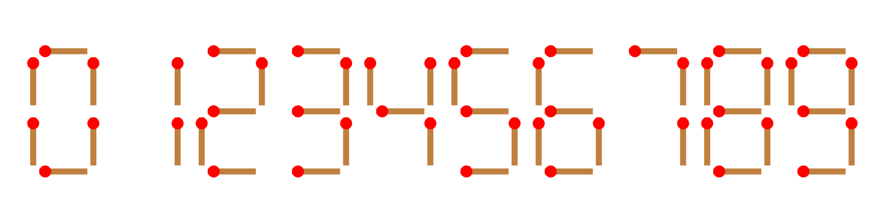 给你 n n n 根火柴棍,你可以拼出多少个形如 A + B = C A+B=C A+B=C 的等式?等式中的 A A A、 B B B、 C C C 是用火柴棍拼出的整数(若该数非零,则最高位不能是 0 0 0)。用火柴棍拼数字 0 ∼ 9 0\sim9 0∼9 的拼法如图所示: