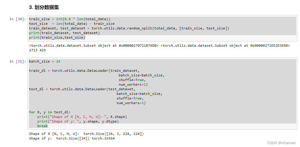 train_size = int(0.8 * len(total_data)) test_size = len(total_data) - train_size train_dataset, test_dataset = torch.utils.data.random_split(total_data, [train_size, test_size]) print(train_dataset, test_dataset) print(train_size,test_size) batch_size = 24 train_dl = torch.utils.data.DataLoader(train_dataset, batch_size=batch_size, shuffle=True, num_workers=1) test_dl = torch.utils.data.DataLoader(test_dataset, batch_size=batch_size, shuffle=True, num_workers=1) for X, y in test_dl: print("Shape of X [N, C, H, W]: ", X.shape) print("Shape of y: ", y.shape, y.dtype) break二、构建简单的CNN网络