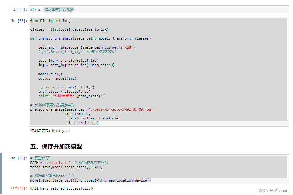 from PIL import Image classes = list(total_data.class_to_idx) def predict_one_image(image_path, model, transform, classes): test_img = Image.open(image_path).convert('RGB') # plt.imshow(test_img) # 展示预测的图片 test_img = transform(test_img) img = test_img.to(device).unsqueeze(0) model.eval() output = model(img) _,pred = torch.max(output,1) pred_class = classes[pred] print(f'预测结果是:{pred_class}') # 预测训练集中的某张照片 predict_one_image(image_path='./Data/Monkeypox/M01_01_00.jpg', model=model, transform=train_transforms, classes=classes)五、保存并加载模型