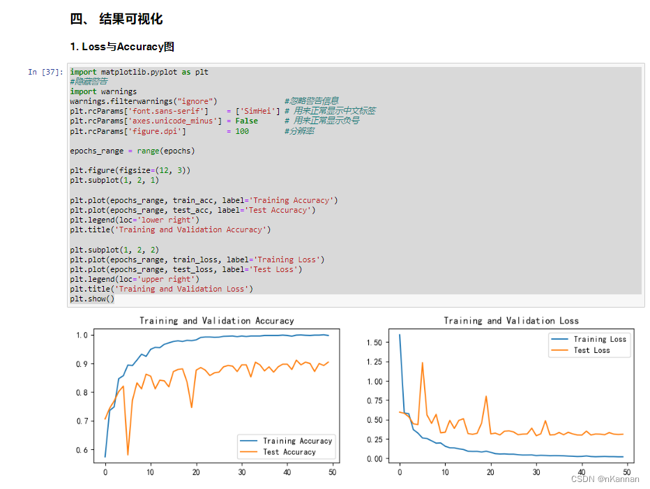 import matplotlib.pyplot as plt #隐藏警告 import warnings warnings.filterwarnings("ignore") #忽略警告信息 plt.rcParams['font.sans-serif'] = ['SimHei'] # 用来正常显示中文标签 plt.rcParams['axes.unicode_minus'] = False # 用来正常显示负号 plt.rcParams['figure.dpi'] = 100 #分辨率 epochs_range = range(epochs) plt.figure(figsize=(12, 3)) plt.subplot(1, 2, 1) plt.plot(epochs_range, train_acc, label='Training Accuracy') plt.plot(epochs_range, test_acc, label='Test Accuracy') plt.legend(loc='lower right') plt.title('Training and Validation Accuracy') plt.subplot(1, 2, 2) plt.plot(epochs_range, train_loss, label='Training Loss') plt.plot(epochs_range, test_loss, label='Test Loss') plt.legend(loc='upper right') plt.title('Training and Validation Loss') plt.show()指定图片进行预测