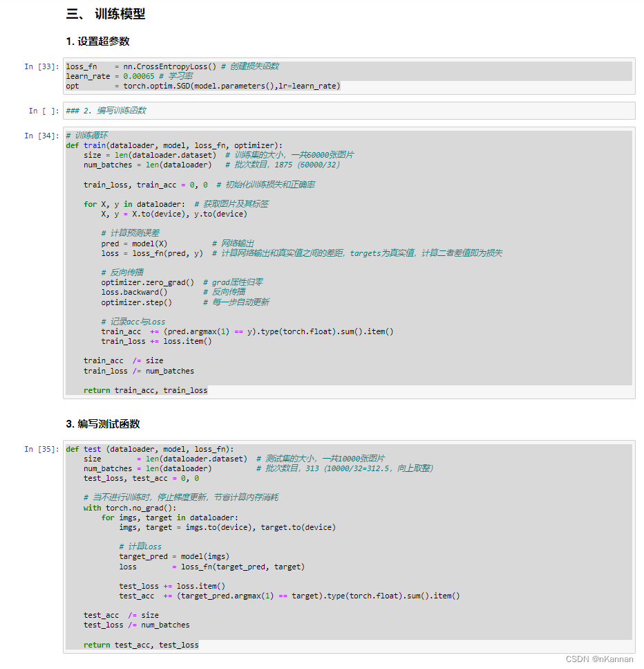 loss_fn = nn.CrossEntropyLoss() # 创建损失函数 learn_rate = 0.00065 # 学习率 opt = torch.optim.SGD(model.parameters(),lr=learn_rate) # 训练循环 def train(dataloader, model, loss_fn, optimizer): size = len(dataloader.dataset) # 训练集的大小,一共60000张图片 num_batches = len(dataloader) # 批次数目,1875(60000/32) train_loss, train_acc = 0, 0 # 初始化训练损失和正确率 for X, y in dataloader: # 获取图片及其标签 X, y = X.to(device), y.to(device) # 计算预测误差 pred = model(X) # 网络输出 loss = loss_fn(pred, y) # 计算网络输出和真实值之间的差距,targets为真实值,计算二者差值即为损失 # 反向传播 optimizer.zero_grad() # grad属性归零 loss.backward() # 反向传播 optimizer.step() # 每一步自动更新 # 记录acc与loss train_acc += (pred.argmax(1) == y).type(torch.float).sum().item() train_loss += loss.item() train_acc /= size train_loss /= num_batches return train_acc, train_loss def test (dataloader, model, loss_fn): size = len(dataloader.dataset) # 测试集的大小,一共10000张图片 num_batches = len(dataloader) # 批次数目,313(10000/32=312.5,向上取整) test_loss, test_acc = 0, 0 # 当不进行训练时,停止梯度更新,节省计算内存消耗 with torch.no_grad(): for imgs, target in dataloader: imgs, target = imgs.to(device), target.to(device) # 计算loss target_pred = model(imgs) loss = loss_fn(target_pred, target) test_loss += loss.item() test_acc += (target_pred.argmax(1) == target).type(torch.float).sum().item() test_acc /= size test_loss /= num_batches return test_acc, test_loss正式训练