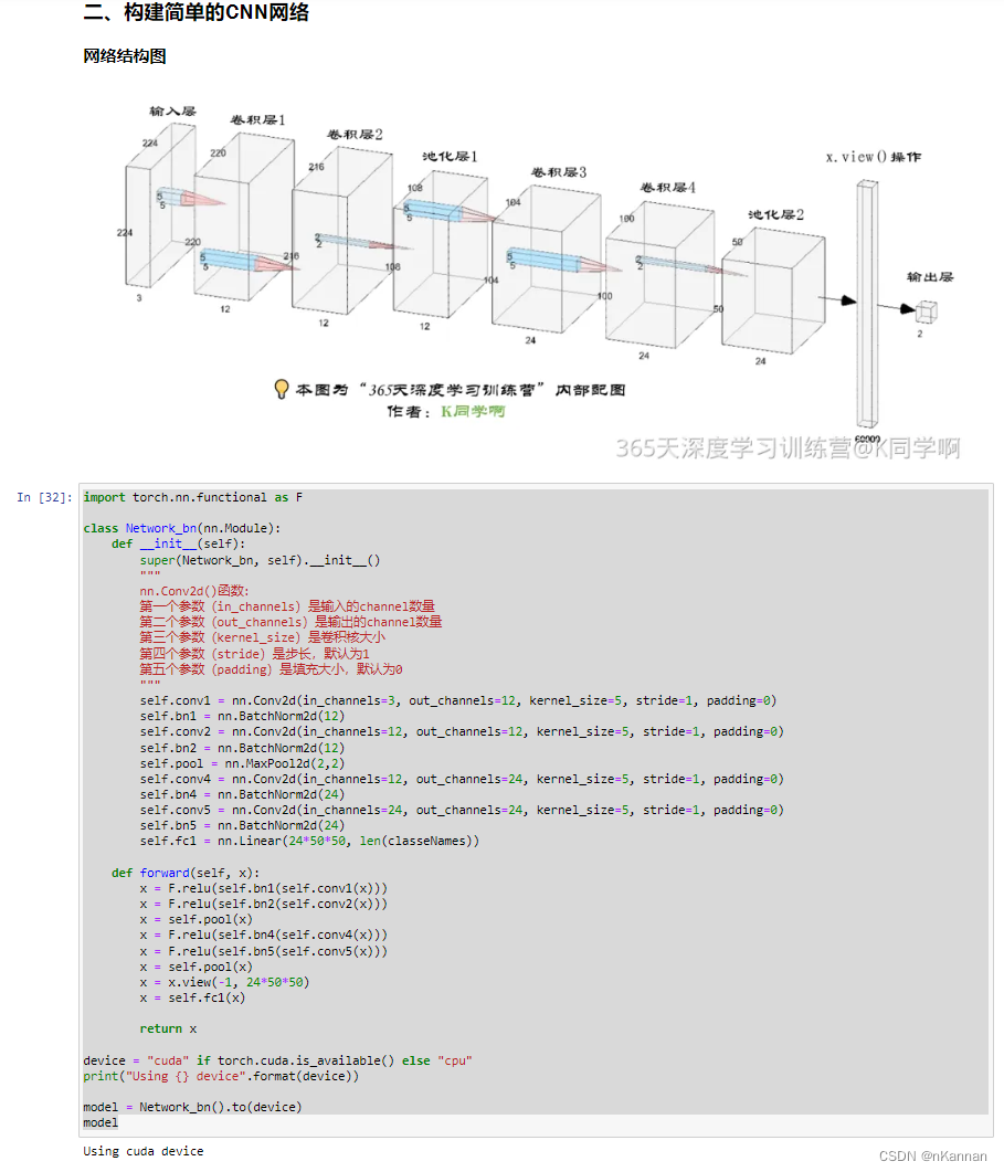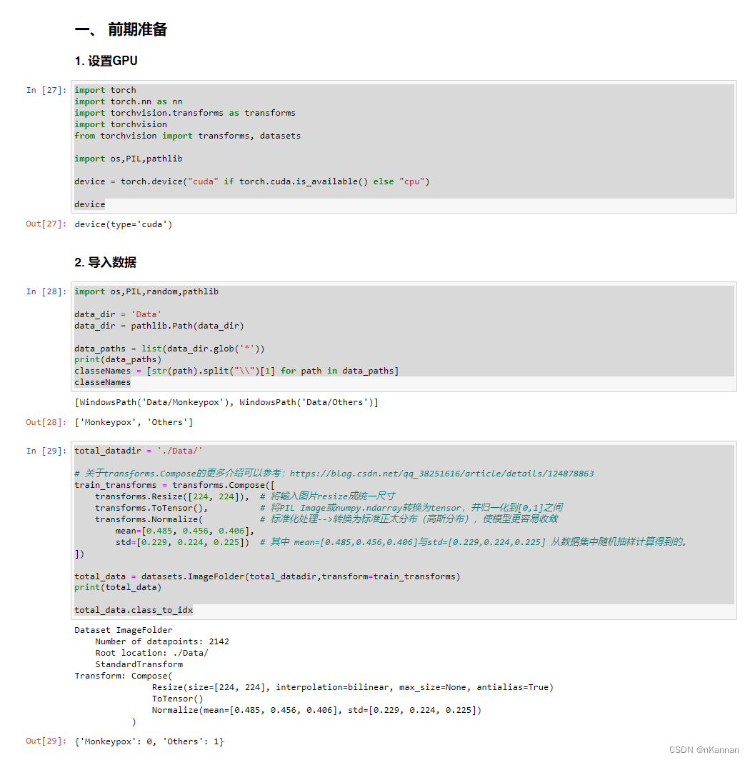 import torch import torch.nn as nn import torchvision.transforms as transforms import torchvision from torchvision import transforms, datasets import os,PIL,pathlib device = torch.device("cuda" if torch.cuda.is_available() else "cpu") device2. 导入数据