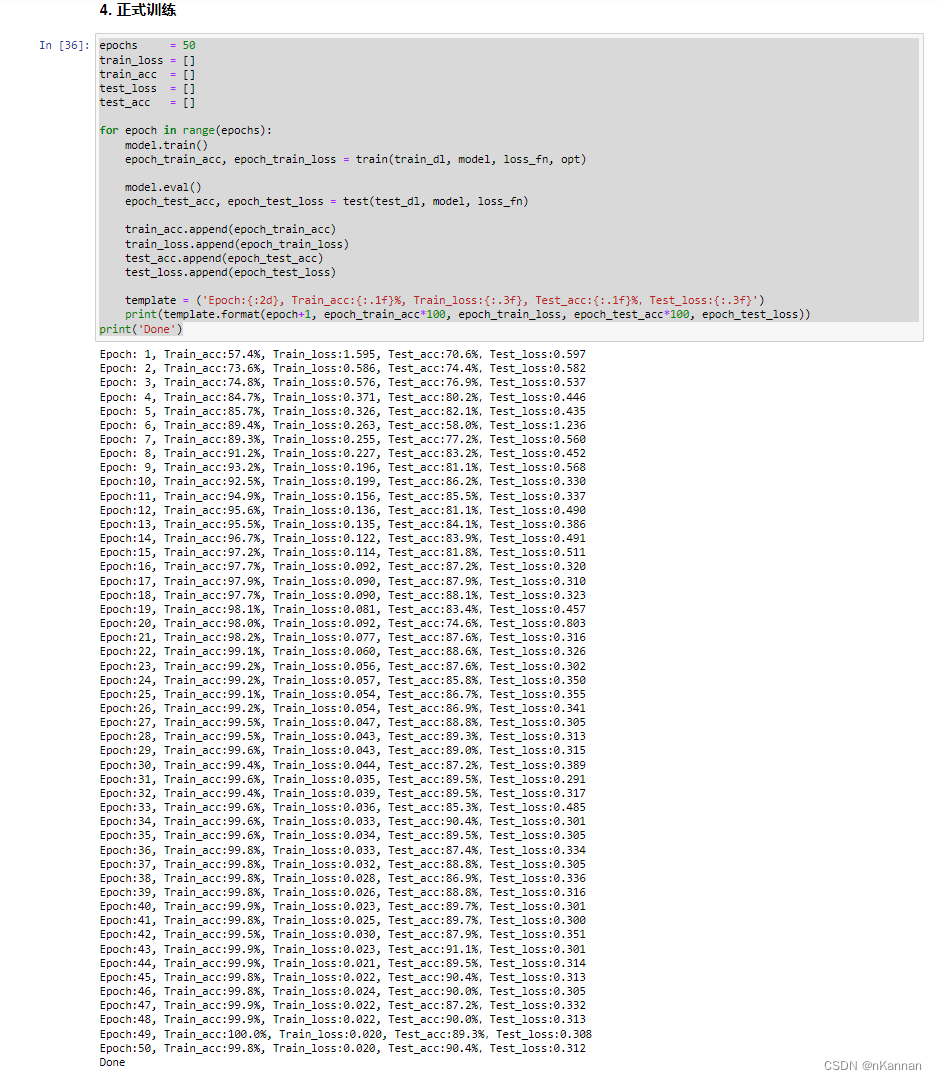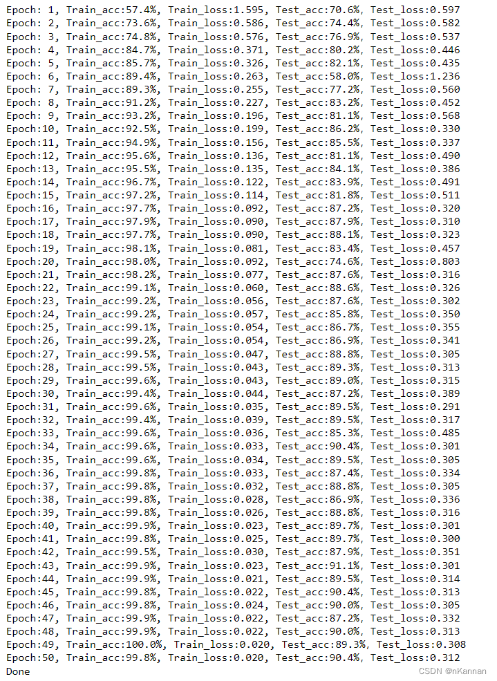 epochs = 50 train_loss = [] train_acc = [] test_loss = [] test_acc = [] for epoch in range(epochs): model.train() epoch_train_acc, epoch_train_loss = train(train_dl, model, loss_fn, opt) model.eval() epoch_test_acc, epoch_test_loss = test(test_dl, model, loss_fn) train_acc.append(epoch_train_acc) train_loss.append(epoch_train_loss) test_acc.append(epoch_test_acc) test_loss.append(epoch_test_loss) template = ('Epoch:{:2d}, Train_acc:{:.1f}%, Train_loss:{:.3f}, Test_acc:{:.1f}%,Test_loss:{:.3f}') print(template.format(epoch+1, epoch_train_acc*100, epoch_train_loss, epoch_test_acc*100, epoch_test_loss)) print('Done')