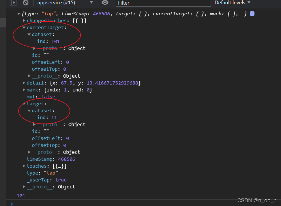 比如在点击打电话的时候首先将target.dateset.ind赋值为11,然后冒泡到父级元素上,将currentTarget.dateset.ind赋值为101,