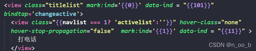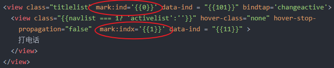 <view class="titlelist" mark:ind='{{0}}' data-ind = "{{101}}" bindtap='changeactive'>
