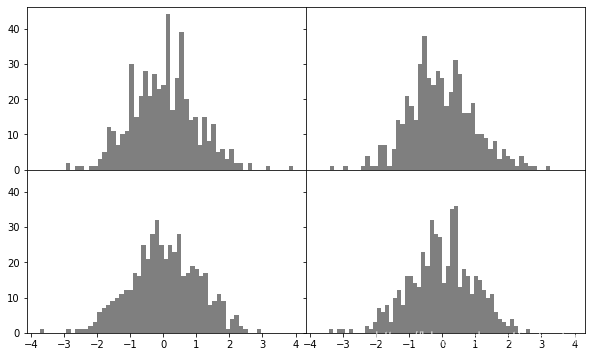 axes[i, j].hist(np.random.randn(500), bins=50, color='k', alpha=0.5)