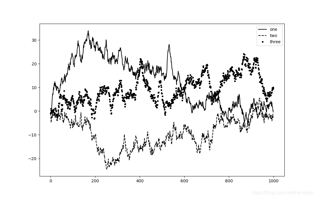 ax.plot(randn(1000).cumsum(), 'k--', label='two')