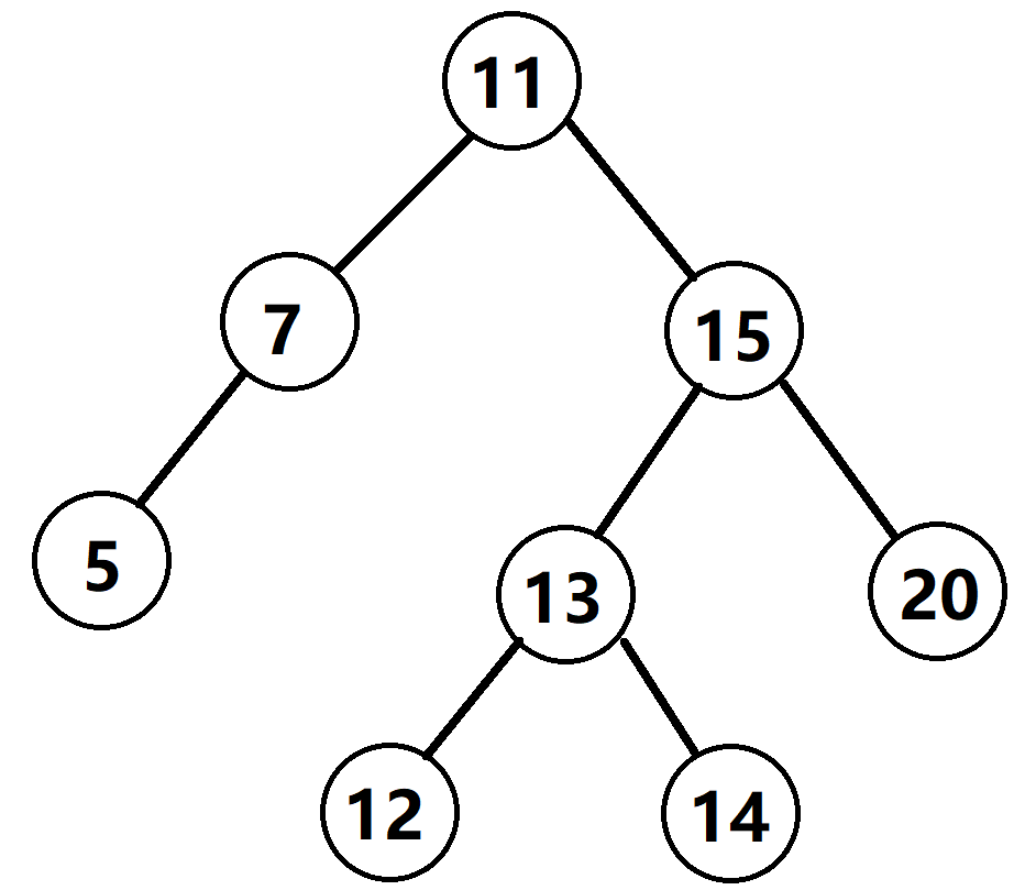 前序遍历:[11, 7, 5, 15,13, 12, 14, 20]