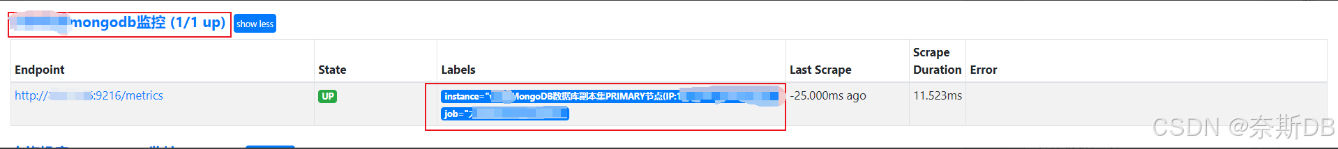 [root@prometheus ~]# vi /opt/prometheus/prometheus.yml 在scrape_configs下面新增如下内容: # mongodb_exporter配置 ###job_name 用来唯一标识一个监控任务。在同一个 prometheus.yml 文件中,不同的 scrape_config可以有不同的job_name,以便 Prometheus 能够区分和管理不同的监控目标和配置,用来将不同的监控目标分组。单位为监控mongodb数据库设置一个独立的job_name - job_name: "mongodb监控" scrape_interval: 15s ###指定这个job_name每隔多久从每个目标(如 Exporter、应用端点)拉取一次指标数据。优先级:会覆盖全局的 global:scrape_interval(如果存在)。 file_sd_configs: - files: - /data/prometheus/conf.d/mongodb_targets.json # mongodb需要监控的实例都单独写在了mongodb_targets.json文件中,是为了避免prometheus.yml内容过多,看起来更简洁 [root@prometheus ~]# vi /data/prometheus/conf.d/mongodb_targets.json ###因为使用的是16974 json模版,16974模版没有定义太多的选项,所以只定义目标(targets)、实例信息(instance)即可 [ { "targets": [ "110.120.100.190:9216" ], "labels": { "instance": "MongoDB数据库副本集PRIMARY节点(IP:110.120.100.190,端口:27027)" } } ]