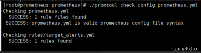 [root@prometheus ~]# cd /opt/prometheus/ [root@prometheus ~]# ./promtool check config prometheus.yml ###用于检查 Prometheus 配置文件(prometheus.yml)的语法和格式是否正确。执行这条命令会执行以下操作: