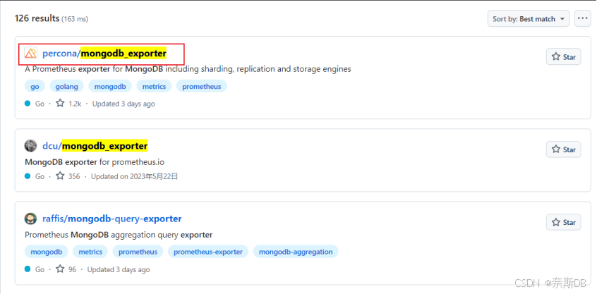 一、通过gitHub(官网地址:https://github.com/)下载mongodb_exporter安装包,在gitHub搜索“mongodb_exporter”。因为是开源,所以大家都是有时间才会开发,所以选择一个最近更新的