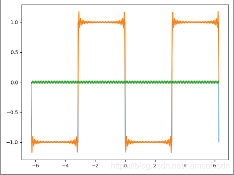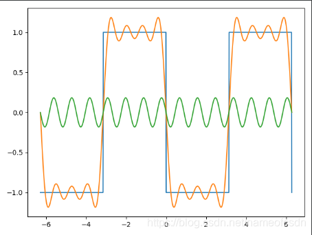 蓝色的是原始函数,绿色的是傅里叶级数的第n项,橙色的是傅里叶级数的前n项和。