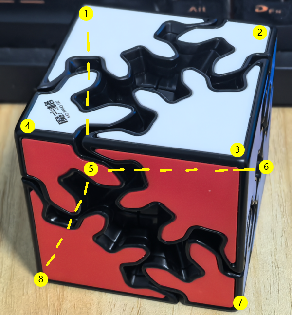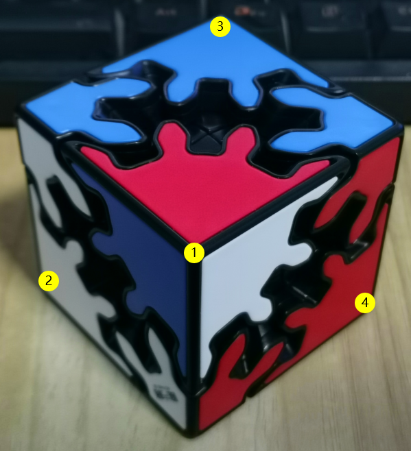 对于6个面的任意一面,拉出4个角块,执行半旋转操作,使得2个大角块顺时针旋转1格(40度),2个小角块逆时针旋转1格(60度),再合并成正方体。