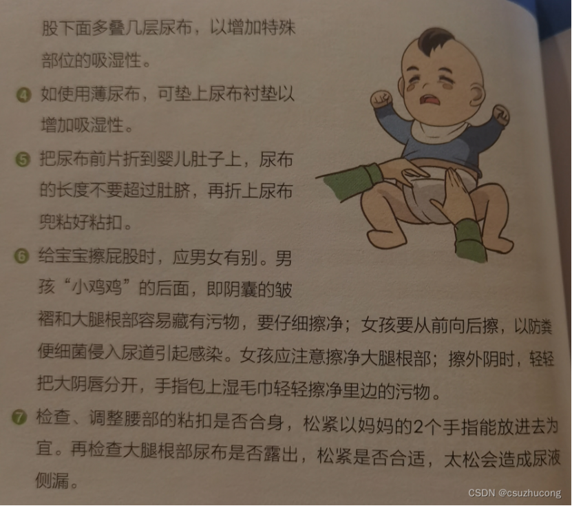 回应婴儿的哭泣时,首先应解决他最迫切的需求。如果他又冷又 饿,尿片也湿透了,应该先帮他保暖,再换尿片,然后喂奶。假如哭声 听起来有点尖利或惊恐,应考虑有可能衣物或其他东西让他感觉不舒服 ——或许有头发缠住了他的手指或脚趾。如果婴儿不冷、尿片干爽、肚 子不饿,但还是哭个不停,可尝试下列安抚手段并找出孩子最喜欢的那 些。 ■ 摇动,用摇椅或把他抱在怀里轻轻来回摇摆。 ■ 轻轻抚摸他的头或拍打他的后背、前胸。 ■ 打个襁褓(用婴儿抱毯将他舒舒服服地裹起来)。 ■ 唱歌或跟他讲话。 ■ 放轻柔的音乐。 ■ 抱着他走动,或用婴儿手推车、伞车等推着他四处走走。 ■ 有节奏的声音和振动。 ■ 给他拍嗝,排出肚子里的气。 ■ 洗热水澡(大部分婴儿喜欢,但不是都喜欢)。