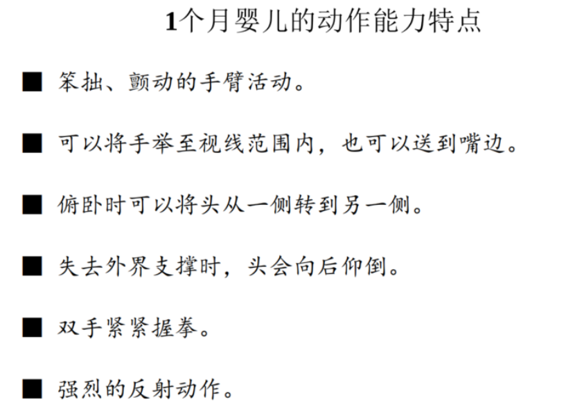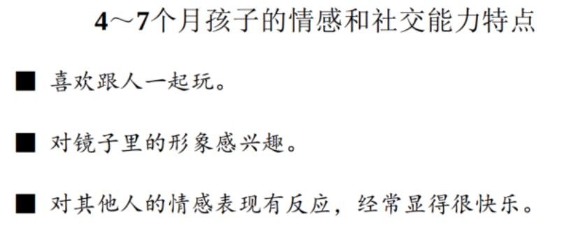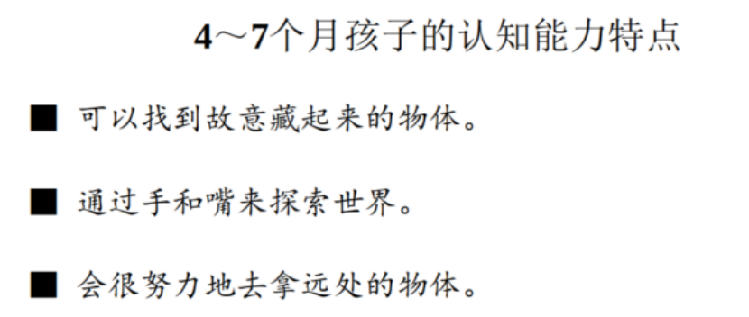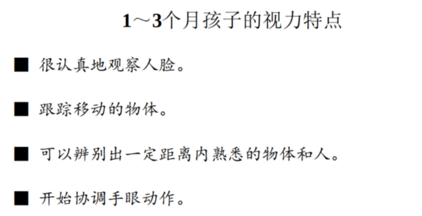 视力特点:色觉完全发育成熟。远视视力成熟。跟踪移动物体的能力提高。