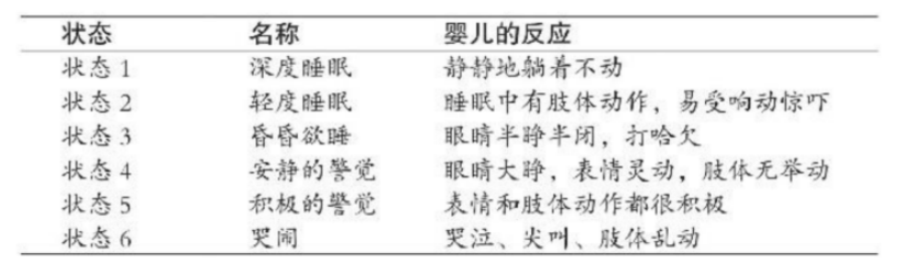 婴儿有6种不同的意识状态,每天会循环几次。2种是睡眠状态,其余的属于清醒状态。