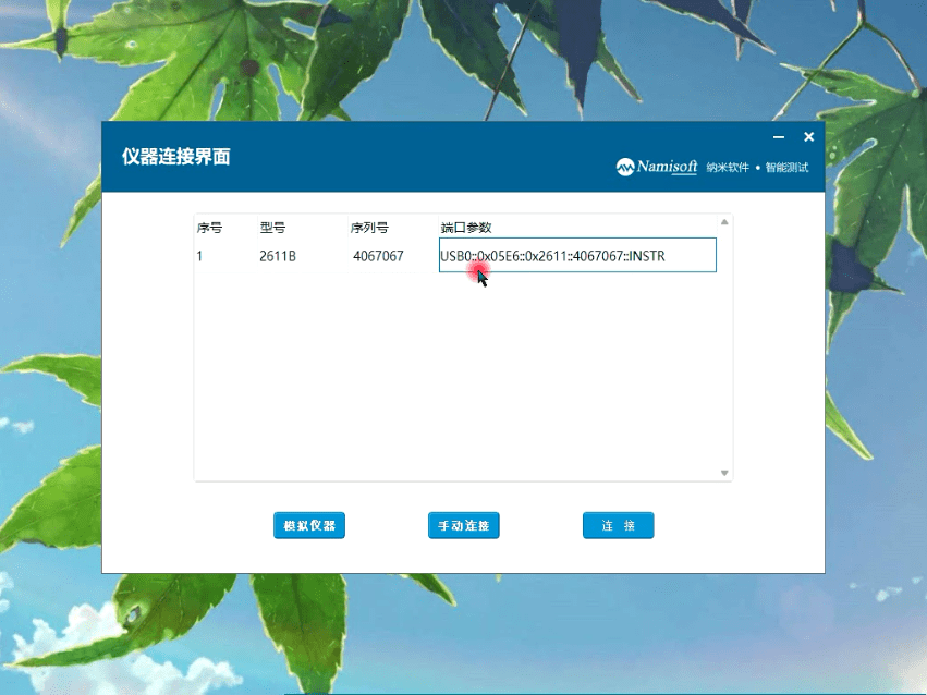 仪器连接界面可以进行吉时利源表的连接,软件会自动检测仪器型号并进行自动连接,也可选择手动连接。