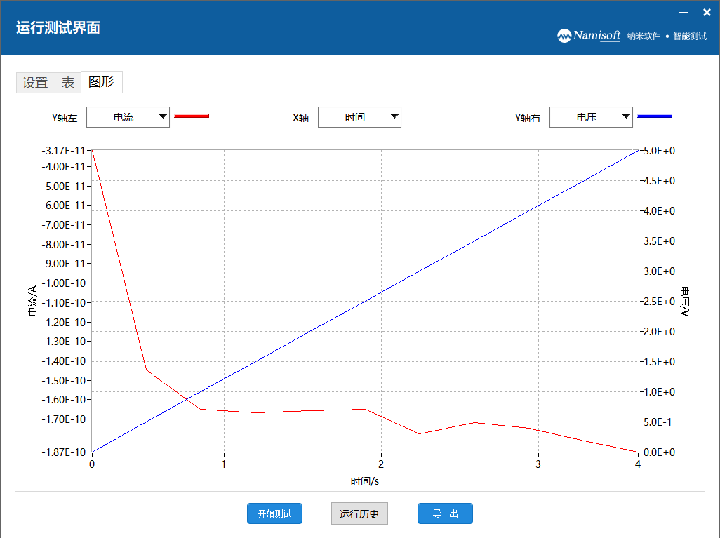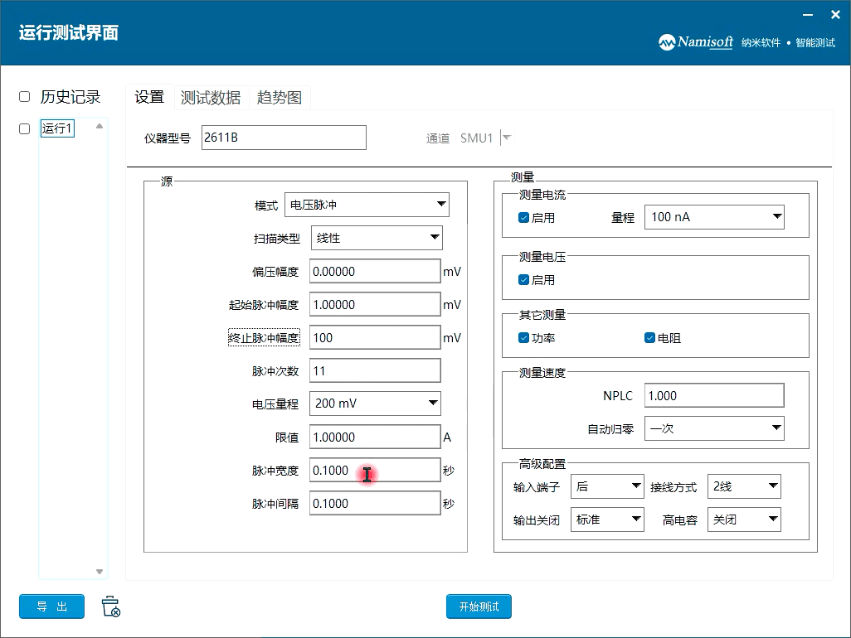 运行测试界面中间显示的是配置、测试数据、趋势图。在配置界面可以进行源表相关参数的配置,配置完成后点击开始测试进行相应参数的测量和绘图。