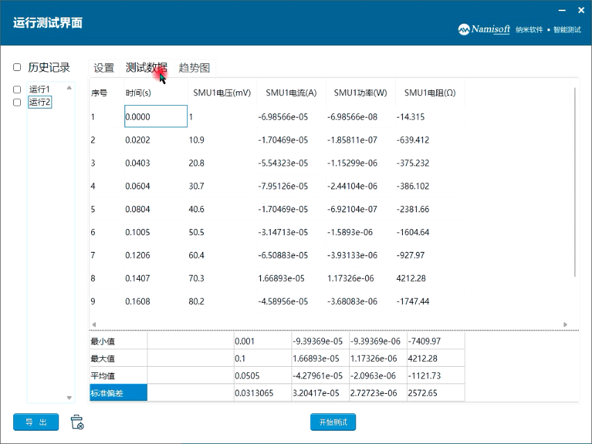 开始测试后点击运行测试界面上方的测试数据进入数据显示界面,如图所示。在数据显示界面可以查看当前测试的测量数据,同时下方显示了当前列数据的最大值、最小值、平均值和标准偏差,方便进行数据分析。