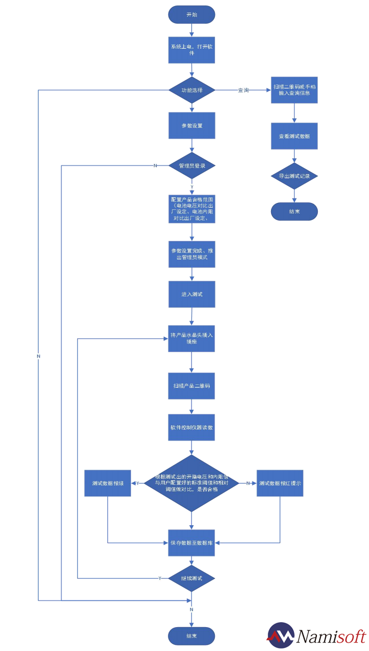 用户希望纳米Namisoft帮他们设计开发一款系统,要求系统软件安装在PC控制装置上,系统通过使用USB、RS232、LAN通讯接口实现对锂电池测试过程中所用到的仪器(内阻测试仪、扫码枪、触摸显示器和电源模块等)进行软件控制,实现对锂电池的测试。可把测试结果与原厂电阻值对比,设置误差范围,超出范围提示被测产品不符合要求,测试结束后可以自动生成测试报告,并同步实时保存测试报告于客户指定保存路径。