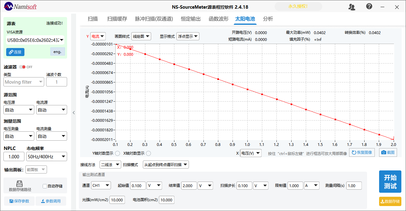 NS-SourceMeter源表软件-太阳能电池测试模块可以长时间连续测量需要保存的测量参数以及不同通道下参数随时间的变化曲线,测量参数如下:短路电流ISC(mA)、开路电压VOC(V)、最大功率PMAX(mW)、填充因子FF(%)、转换效率EFF(%)、最大功率点电流IM(mA)、最大功率点电压VM(V)、串联电阻RS(ohm)、并联电阻RSH(ohm)、短路电流密度Jsc(mA/cm2)。