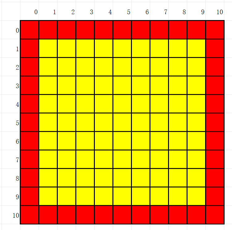 此图的黄色部分表示扫雷棋盘的大小,而红色部分加黄色部分则是实际扫雷棋盘大小。由图可知,实际棋盘可以让我们在对边界坐标进行九宫格内雷数查找的时候不出现越界的情况。