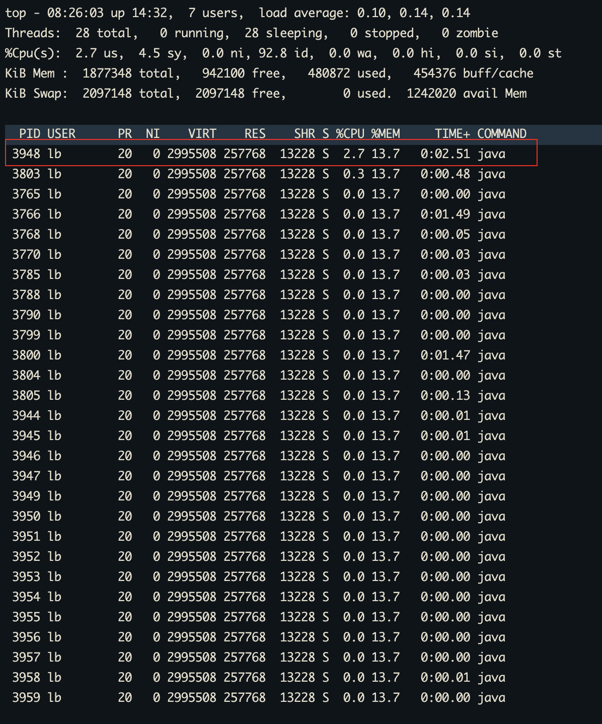 可以看出 3948 这个线程占用率最高