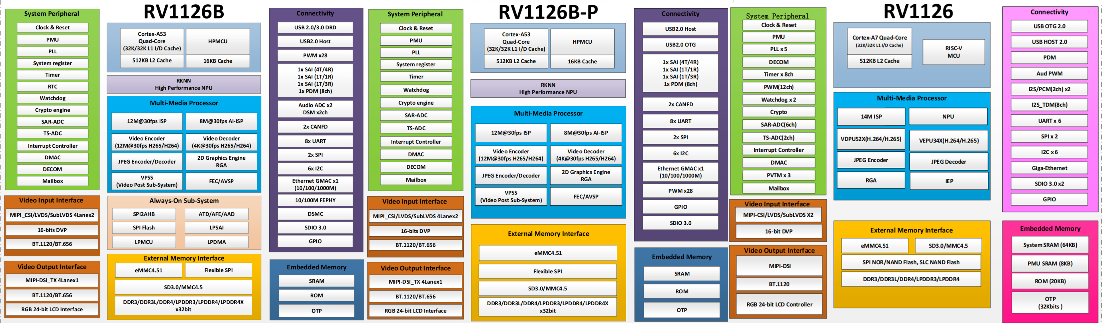 RV1126B与RV1126B-P,核心配置:四核 ARM Cortex-A53,64 位架构,支持 ARM v8-A 指令集。缓存规格:每核 32KB L1 I-Cache + 32KB L1 D-Cache,共享 512KB L2 Cache。扩展特性:集成 Neon Advanced SIMD 与 FPU,支持 TrustZone 技术。