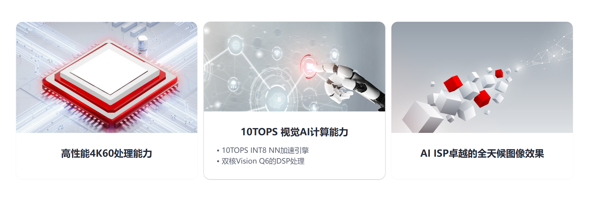 海思 Hi3403V100,海思在 AIISP(图像增强 + AI 算法联合优化)方面具有深厚积累。定位专业视觉 SoC,内置四核A55,10TOPS NPU + ISP 一体化深度耦合。高规格 ISP(逆光、低照度表现极好);多路视频4K输入/输出;AI 算法部署效率高(针对目标检测、跟踪类算法优化)