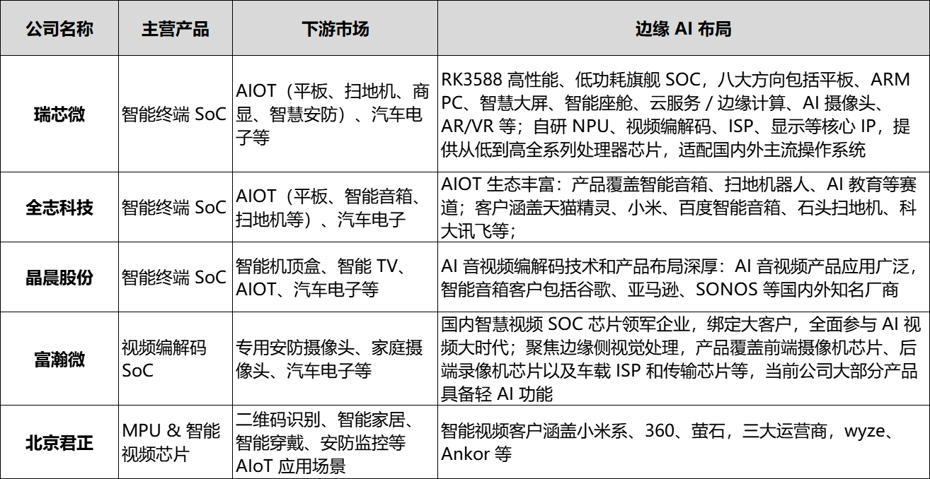 AI 大模型爆发后,算力不再只在云端,越来越多智能算法跑到本地和边缘设备上。智能摄像头能识别人形与行为,车载终端实时监控驾驶,工业相机自动检测缺陷,扫地机也能离线识别目标。边缘 AI 成为落地最快、设备最多、国产替代最强的战场,而国产 SoC 厂商在多媒体和 AI 处理上正迎来窗口期。