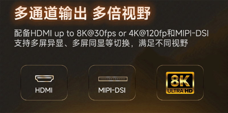 多屏互联:板载 HDMI 输出(支持最高 8K@30fps 或 4K@120fps),并提供 MIPI-DSI 接口,助力多屏异显应用 。