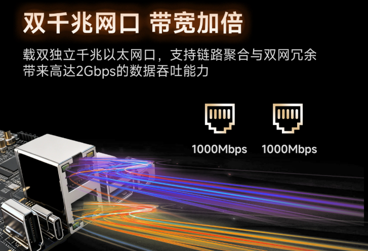全网通通讯:具备双千兆以太网口、双频 WiFi 6、蓝牙 5.4,并预留 mini-PCIe 接口以支持 4G/5G 模块 。